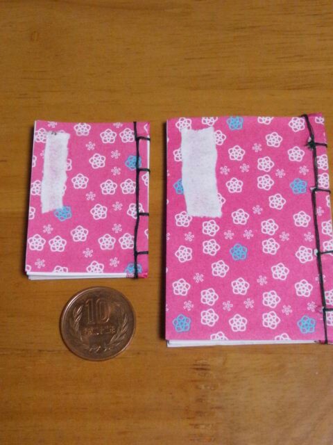 穴あけは押しピン。糸は刺繍糸。本文はコピー用紙を手作業で裁断。表紙は和柄折り紙です。